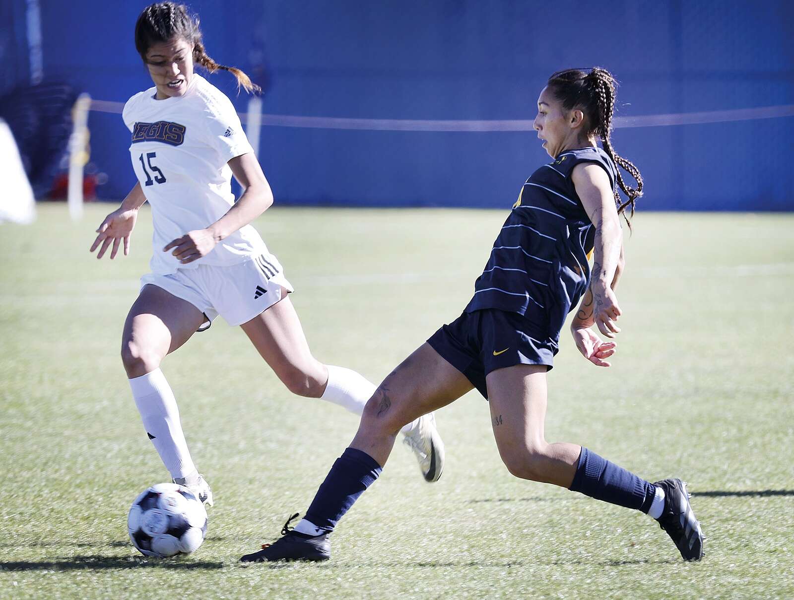 Rozlin Gomez of Fort Lewis College fights for the ball while playing Regis University on Sunday during the Rocky Mountain Athletic Conference tournament at FLC. (Jerry McBride/Durango Herald)