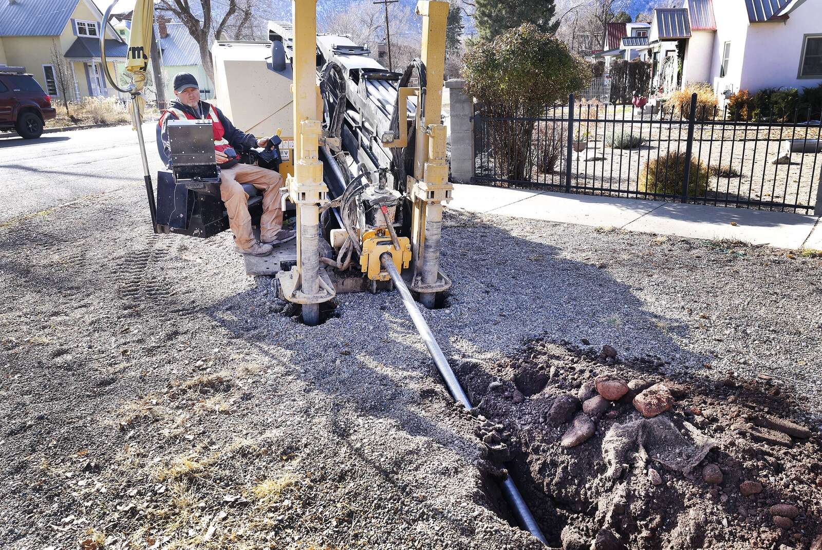 Jon Daulton, with Alpine Excavation, operates a horizontal directional drill as it bores under Alamo Street on Friday while installing a fiber-optic pipe for Clearnetworx. (Jerry McBride/Durango Herald)