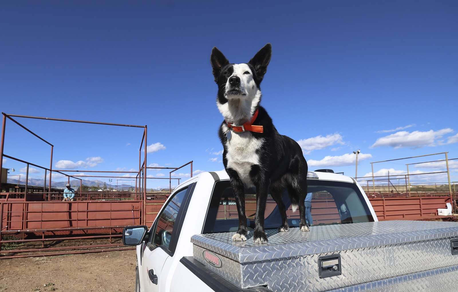 A dog waits for its owner to return to the truck during the High Country Cattle Auction on Sept. 23 in Breen southwest of Durango. (Jerry McBride/Durango Herald)