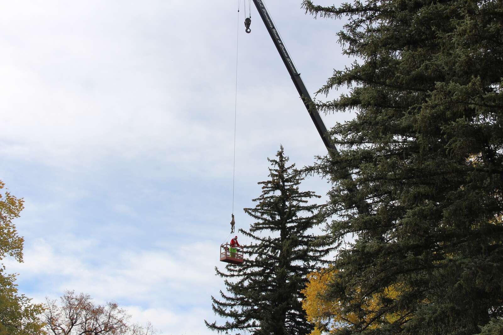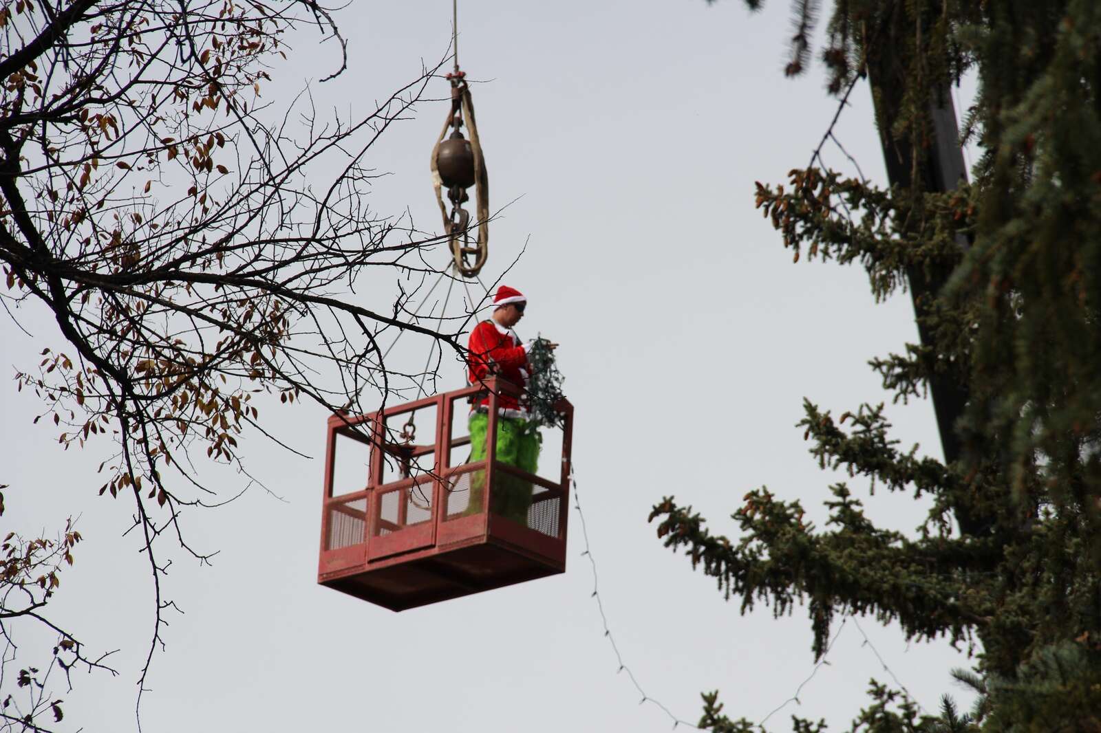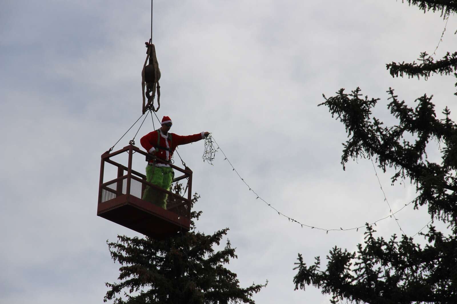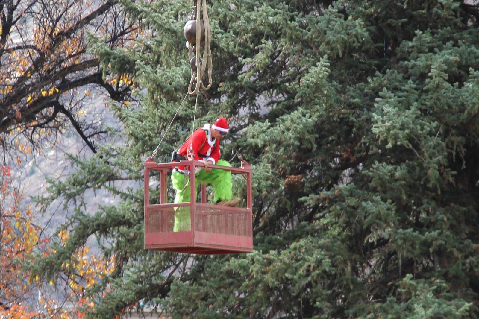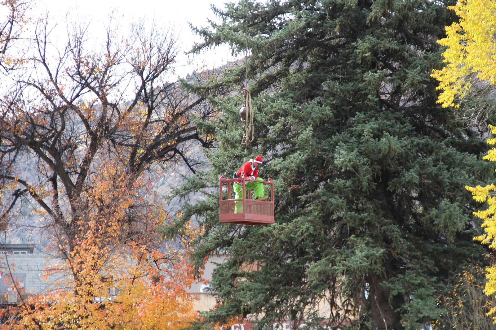 A worker donning a Grinch Santa costume wraps a tree with Christmas lights Monday in Durango's Buckley Park. (Scout Edmondson/Durango Herald)