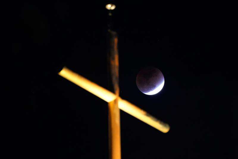A total lunar eclipse is seen behind a cross over a church in Seoul, South Korea, Tuesday, March 3, 2026. (AP Photo/Ahn Young-joon)