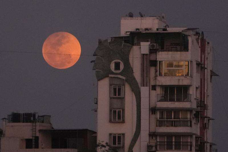 A blood moon rises over Ahmedabad, India, Tuesday, March 3, 2026. (AP Photo/Ajit Solanki)