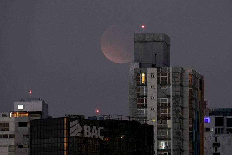 A total lunar eclipse is seen from Panama City before sunrise, Tuesday, March 3, 2026. (AP Photo/Matias Delacroix)