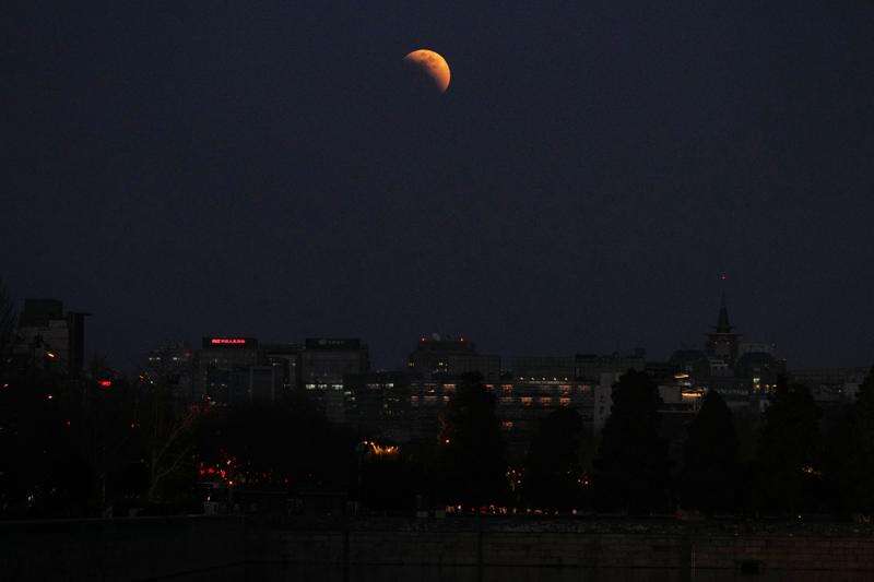 The moon is seen shortly before total lunar eclipse above office buildings in Beijing, China, Tuesday, March 3, 2026. (AP Photo/Andy Wong)