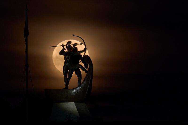 The Worm Moon sets behind the Monument of the Salamis Fighters, also known as Salaminomachoi, on Tuesday, March 3, 2026, on Salamina island, Greece, honoring the ancient Greeks who died in the naval Battle of Salamis in 480 B.C. (AP Photo/Petros Giannakouris)