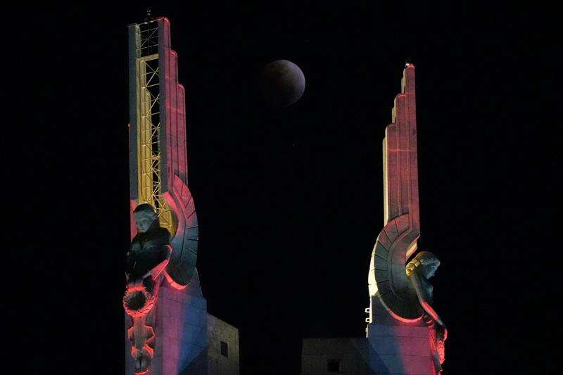 A total lunar eclipse is seen through statues at the Quezon Memorial Shrine in Quezon City, Philippines, Tuesday, March 3, 2026. (AP Photo/Aaron Favila)
