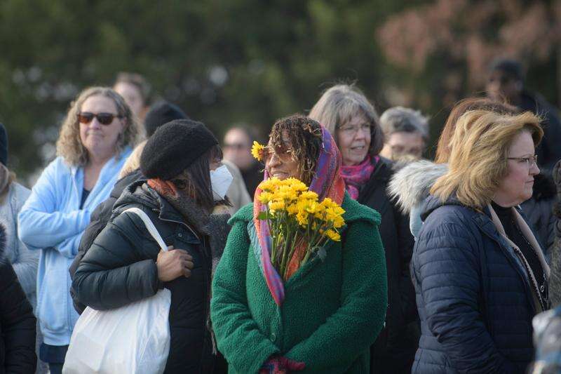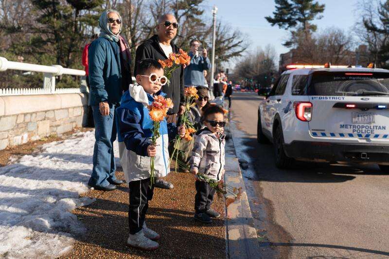 People holding flowers watch the Buddhist monks who are participating in a Walk For Peace walk through a the streets of Washington, Tuesday, Feb. 10, 2026. (AP Photo/Jose Luis Magana)