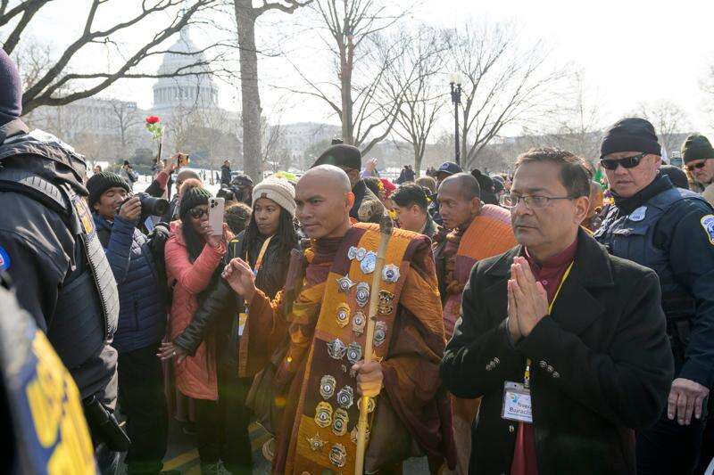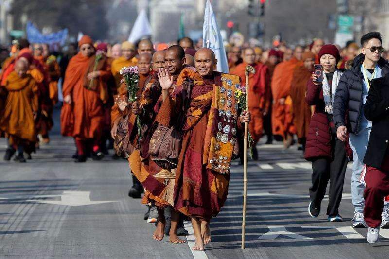 Monk Bhikkhu Pannakara walks along with Buddhist monks who are participating in a Walk For Peace walk through a the streets of Washington, Tuesday, Feb. 10, 2026, (AP Photo/Jose Luis Magana)