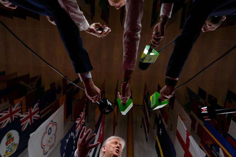 President Donald Trump speaks to reporters as he arrives to attend the draw for the 2026 soccer World Cup at the Kennedy Center in Washington, Friday, Dec. 5, 2025. (AP Photo/Julia Demaree Nikhinson)
