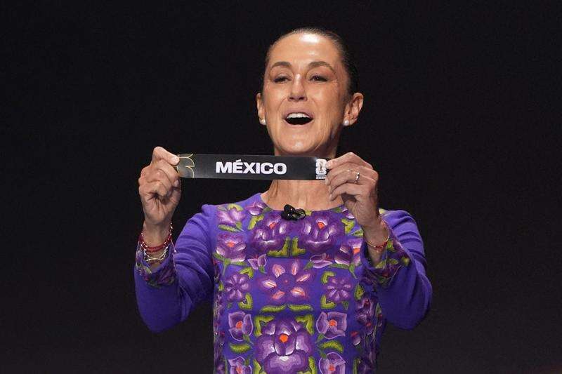 Mexican President Claudia Sheinbaum holds up the team name of Mexico during the draw for the 2026 soccer World Cup at the Kennedy Center in Washington, Friday, Dec. 5, 2025. (AP Photo/Jacquelyn Martin)