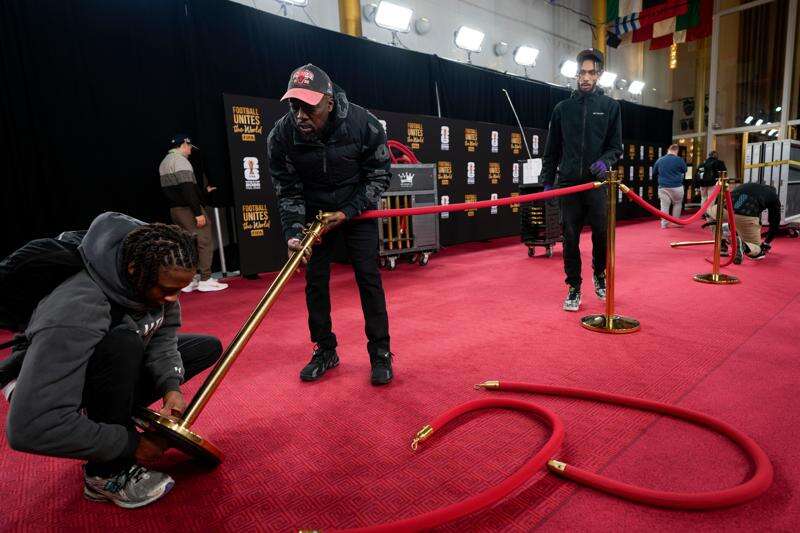 Workers prepare the red carpet area prior to the final draw for the 2026 soccer World Cup at the Kennedy Center in Washington, Thursday, Dec. 4, 2025. (AP Photo/Chris Carlson)