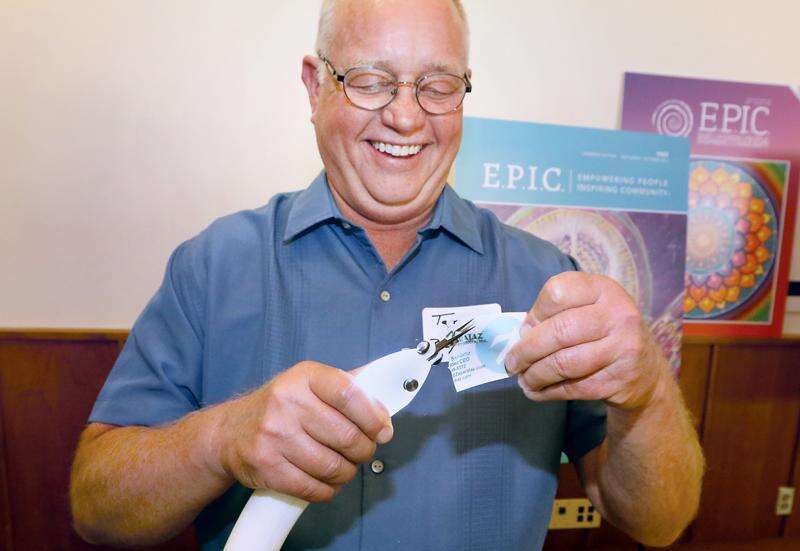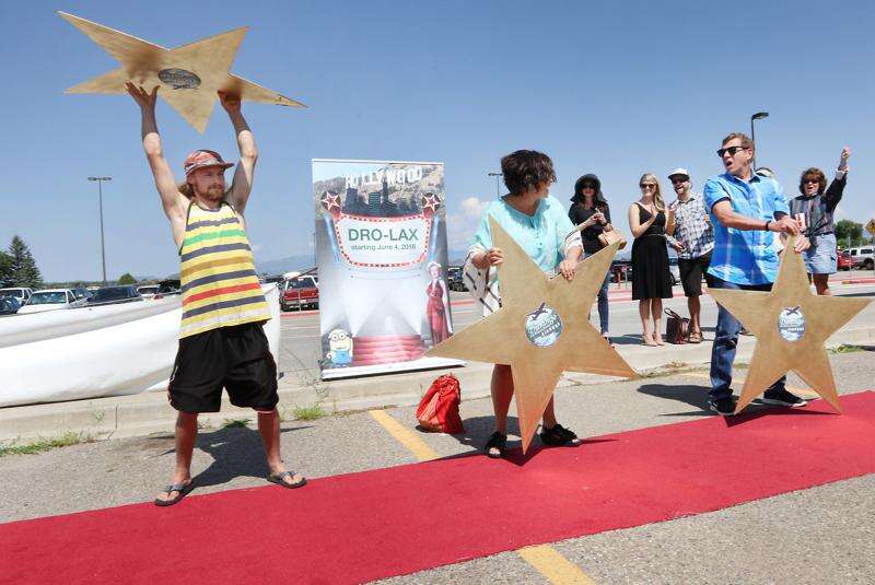 Garrett Tyrrell, left, lifts his star showing the state of California on the back, indicating that he won two free tickets to Los Angeles during the Pack your Bags Contest at Durango-La Plata County Airport on Aug. 20. Karen Kostuch, center, and Brian Gilbert, were finalists. Twenty-six people showed up for the chance of a two-day weekend in the City of Angels. Photo by Jerry McBride/Durango Herald