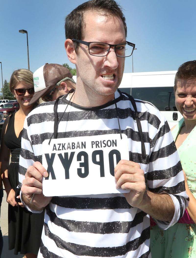 Lior Azulai, in the persona of Sirius Black from the Harry Potter movies, had hoped he would win two free tickets to Los Angeles during the Pack your Bags Contest at the Durango-La Plata County Airport on Aug. 20. Alas, the prize went to Garrett Tyrell, more of a laid-back surfer dude. Photo by Jerry McBride/Durango Herald