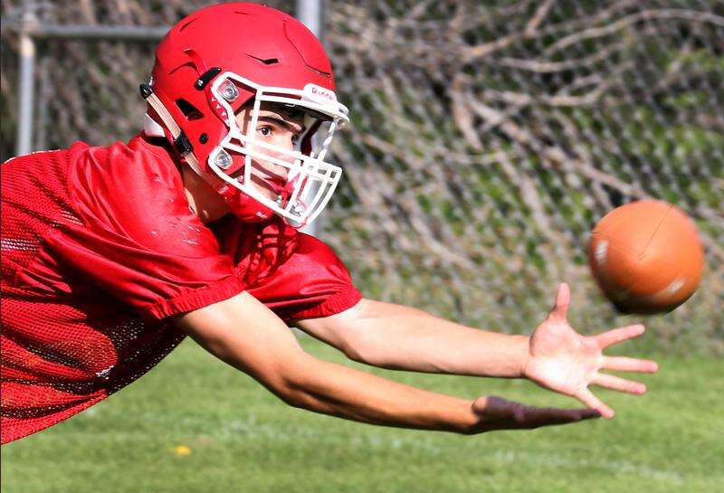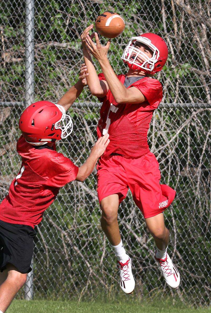 Alexander Hise reaches for a pass on Aug. 15. He is one of many athletes on the Durango High School football team looking to make an impact in 2016. Photo by Jerry McBride/Durango Herald
