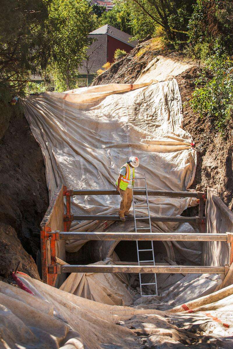A city of Durango worker prepares to climb down a ladder leading to a large pipe installed in the Crestview Ditch off of Avenida del Sol. There used to be two vertical drops in this area of the ditch; one was 10 to 12 feet down, the second was approximately 16 to 18 feet deep. Photo by Shaun Stanley/Durango Herald