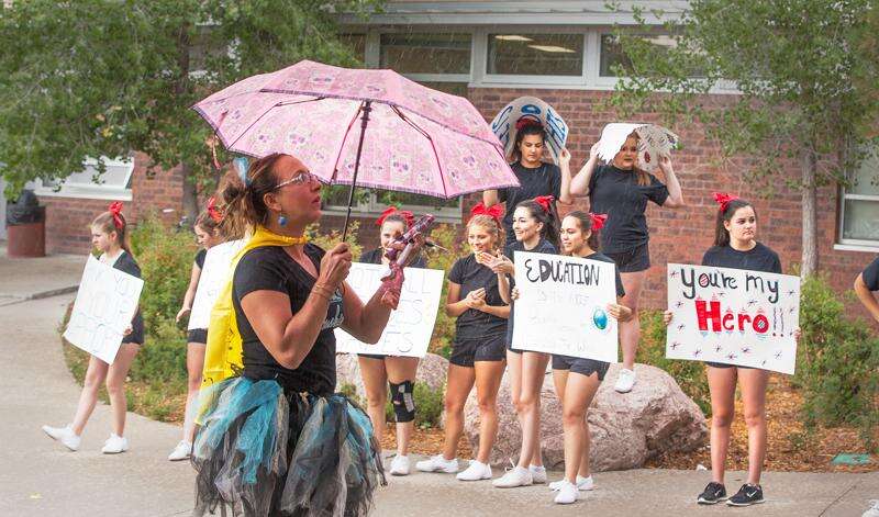 The Durango High School Cheer Squad welcomes Durango School District 9-R teachers and staff members Aug. 19, to the convocation kicking off the new year. The event, which is essentially a pep rally to energize staff before the first day of school, had a theme of “Superheroes” and included some friendly interschool competitions, prizes and food. Photo by Shaun Stanley/Durango Herald