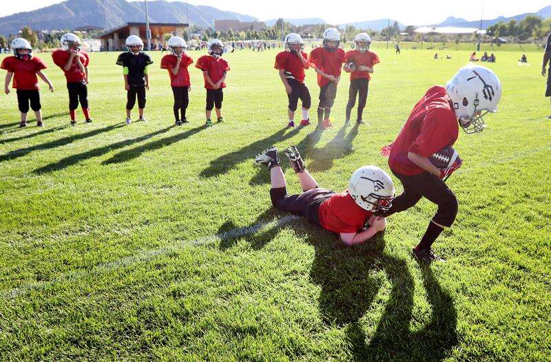 The third-grade Demons, with the Youth American Football League, practice Aug. 17 during the opening of the Smith Sports Complex on the campus of Fort Lewis College. Photo by Jerry McBride/Durango Herald