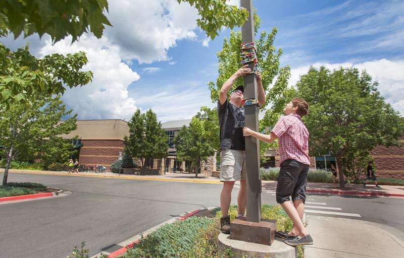 Twelve-year-old Sam Sturm works with Sam Bridgham assembling a Lego creation on a light pole in the parking lot of the Durango Community Recreation Center on Aug. 1. Photo by Shaun Stanley/Durango Herald