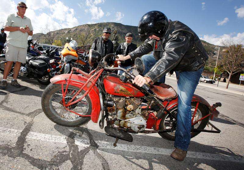 Kevin Linville kick-starts his 1928 Indian Scout 101 as a crowd gathers Sept. 4 at the Durango Transit Center to marvel at the classic bike before the Four Corners Motorcycle Rally Parade. Photo by Jerry McBride/Durango Herald