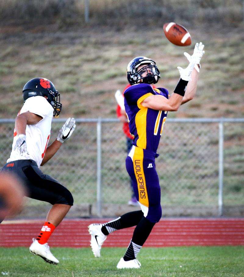 Brian Mashak of Bayfield High School makes the catch and scores a touchdown while playing Aztec High School on Sept. 9 at BHS. Photo by Jerry McBride/Durango Herald