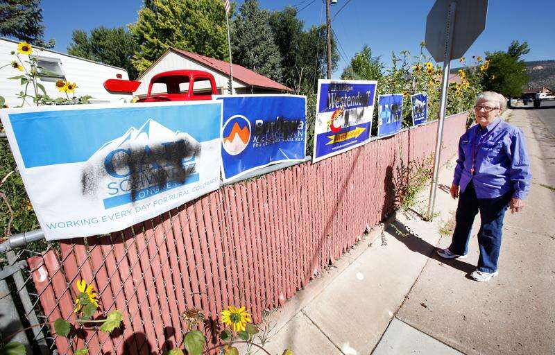 Mary Karraker looks over election signs on a fence that were vandalized at Montview Parkway and Crestview Drive on Sept. 8. Karraker, office manager for the La Plata County Democrats, was on her way home when she noticed the damaged signs. “People don’t deserve this.” she said. Photo by Jerry McBride/Durango Herald