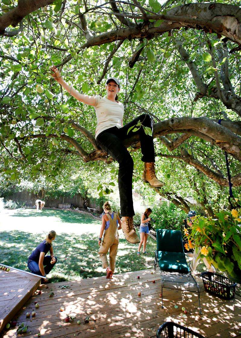 There’s more than one way to get apples out of a tree as Taylor Cramer shakes tree limbs on Sept. 8, bringing down dozens of this year’s bumper crop. Cramer and other Fort Lewis College students along with staff members from the Environmental Center at FLC were harvesting trees around Durango. Photo by Jerry McBride/Durango Herald