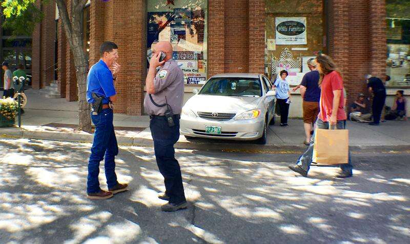 First responders at the scene of a single-vehicle wreck in which a car backed into the Main Mall building in the 800 block of Main Avenue on Sept. 6. There were no reports of injuries. Photo by Shaun Stanley/Durango Herald