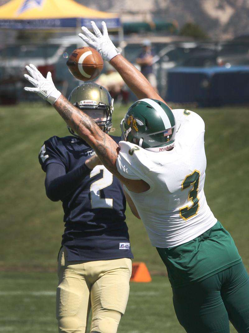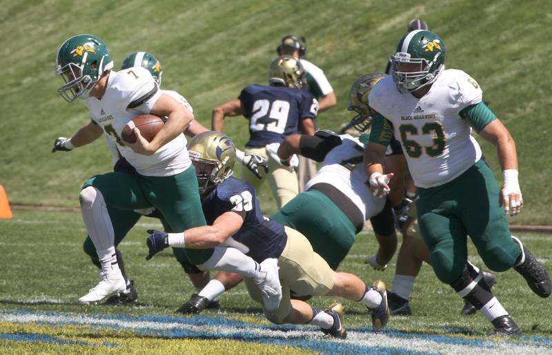 Fort Lewis College quarterback Larry Cutbirth scrambled and threw the ball under pressure on Sept. 10, even once throwing through the arms of Black Hills State defender Damon Goldhammer. Photo by Shaun Stanley/Durango Herald