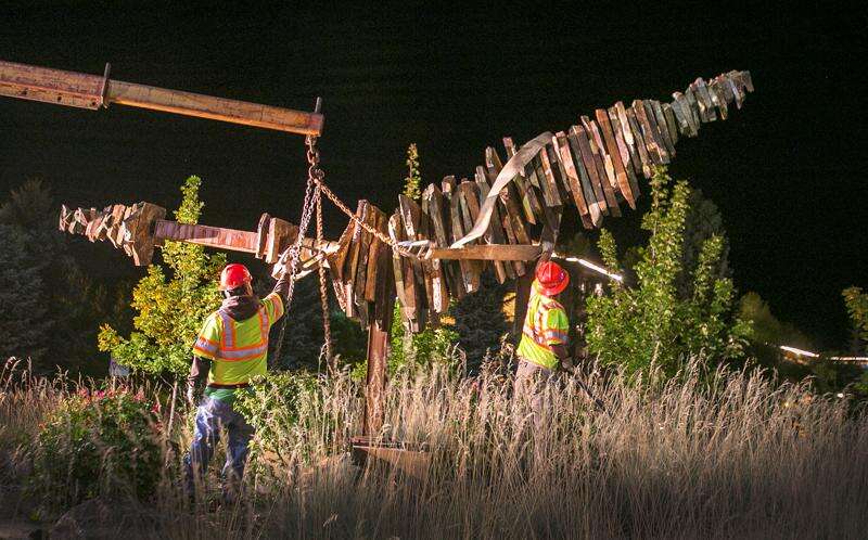 Early on Sept. 9, a city of Durango crew attempts to remove the Arc of History at the U.S. Highway 550/160 intersection, but the controversial piece of art refused to budge. Photo by Shaun Stanley/Durango Herald