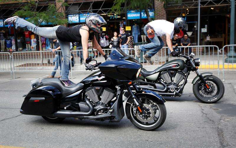 Participants demonstrate their skills during the Four Corners Motorcycle Rally Parade on Sept. 4 on Main Avenue. Photo by Jerry McBride/Durango Herald