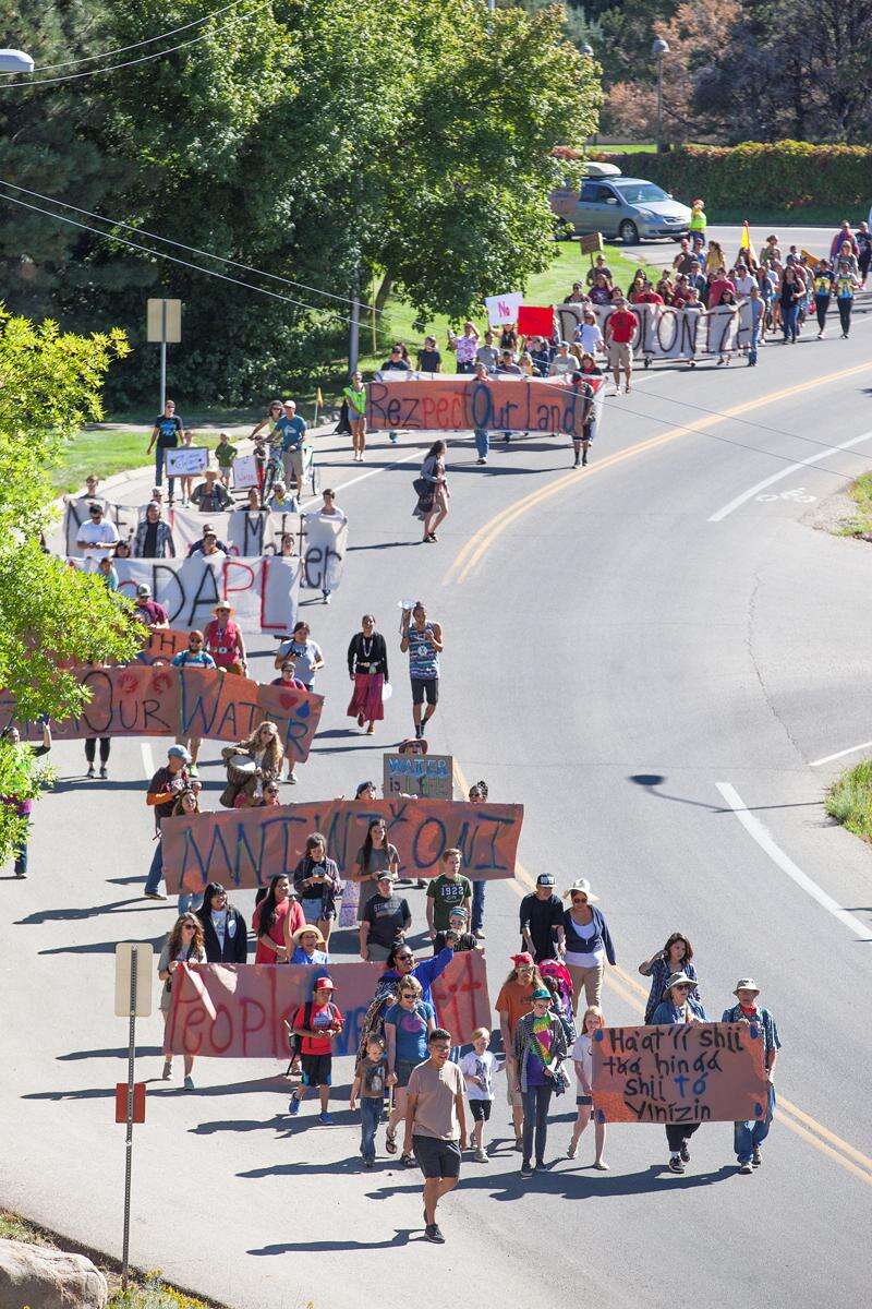 Participants in the Standing Rock 4 Corners March head down East Eighth Avenue from the Fort Lewis College toward Santa Rita Park on Sept. 10. They were marching in support of American Indian tribes protesting an oil pipeline in North Dakota. Photo by Shaun Stanley/Durango Herald