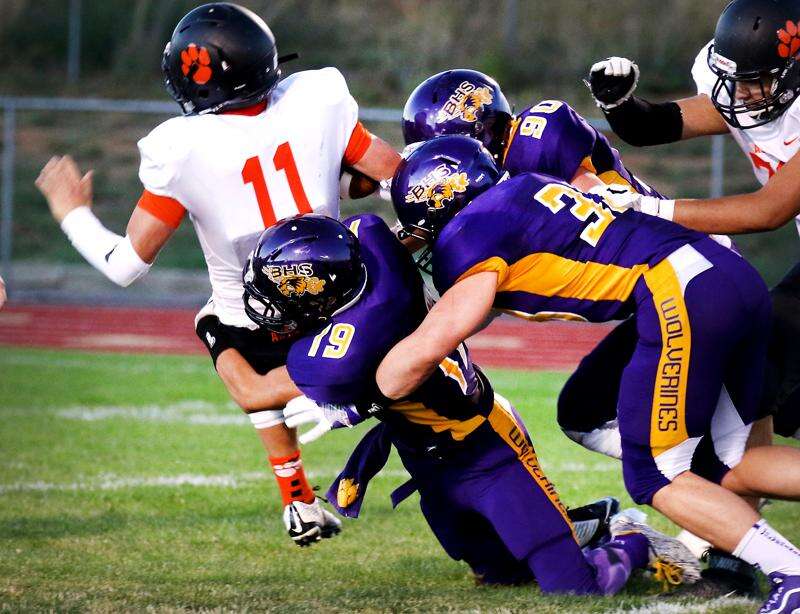 Jesse Westbrook of Bayfield High School sacks quarterback Cody Smith while playing Aztec High School on Sept. 9 at BHS. Photo by Jerry McBride/Durango Herald