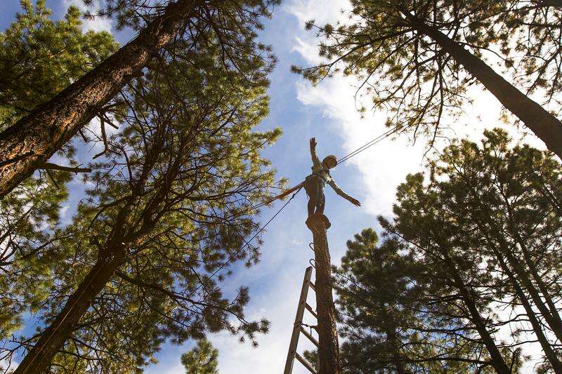 An Animas High School ninth-grade student stands on a trimmed tree before jumping off while negotiating the rope course at On The Edge Productions’ course on Sept. 7. Photo by Shaun Stanley/Durango Herald