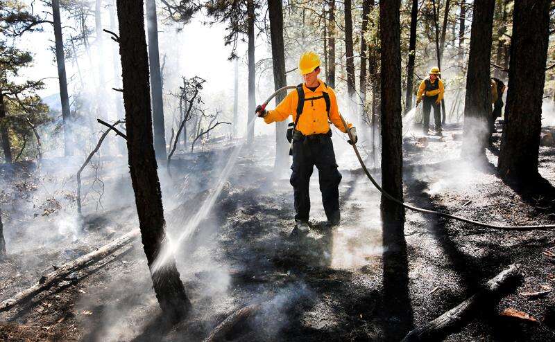 Firefighter Corey Adamy with the Durango Fire Protection District puts out hot spots on a fire Sept. 9 northwest of Durango. The fire, on a ridge above La Plata County Road 205, broke out in the undeveloped Durango Estates subdivision, burning about one-third of an acre and a couple of ponderosa pines before being contained. The cause is under investigation. Photo by Jerry McBride/Durango Herald