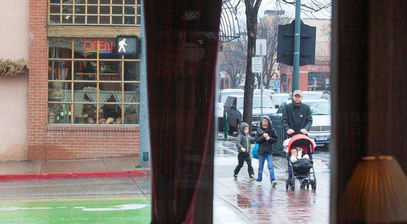 Residents and visitors broke out their winter coats and boots Nov. 21, in Durango with the arrival of a Pacific storm. It brought snow to the San Juan Mountains, including 1 foot at Purgatory Resort, by the afternoon. Visitors to downtown Durango cross College Avenue at Main Avenue on Monday as seen through the windows of the General Palmer Hotel. Photo by Shaun Stanley/Durango Herald