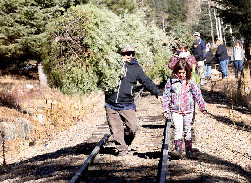 Jeremiah Chavez carries the family Christmas tree with wife, Jackie, and their daughter, Savannah, 10, on Nov. 26, after cutting it down during the Durango & Silverton Narrow Gauge Railroad Christmas Tree Train. The train dropped off people with about 30 tree-cutting permits near the Cascade Wye north of Durango. Photo by JERRY McBRIDE/Durango Herald