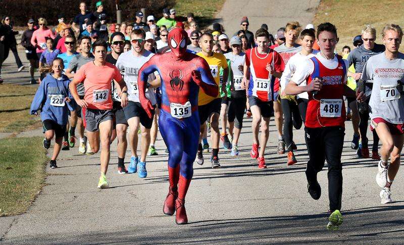 Spider-Man, a.k.a. Ricki Gilmour, of Cortez, along with more than 600 runners took part in this year’s Durango Running Club’s Turkey Trot on Thanksgiving morning at Fort Lewis College. The event is sponsored by Mercy Regional Medical Center. This year, proceeds will go to Manna Soup Kitchen. In addition, each year some proceeds will go to a different nonprofit animal shelter. Photo by JERRY McBRIDE/Durango Herald