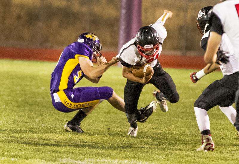 Bayfield High School’s Macoy Michaeli interrupts a run Sept. 30 by Gunnison High School’s Luke Tovar in Bayfield. Photo by Shaun Stanley/Durango Herald