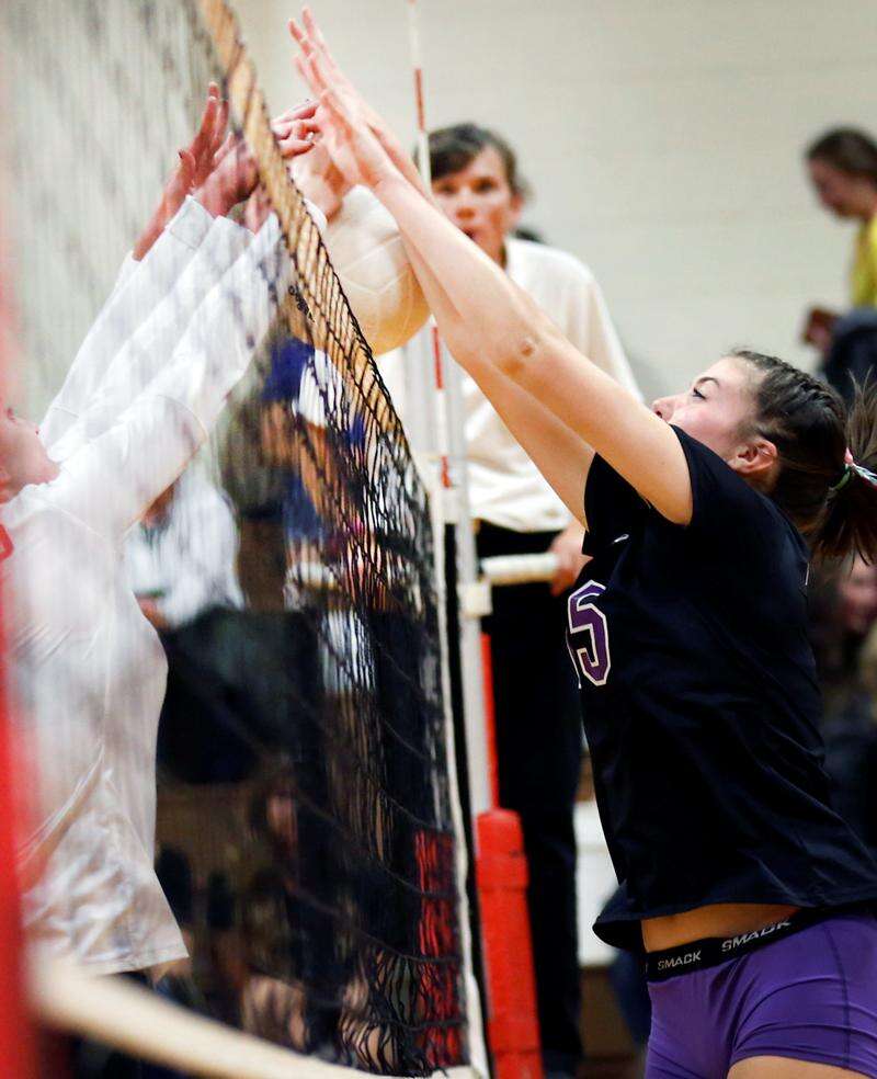 Faith Dowling of Durango High School hits the ball Sept. 27 as Sydney Gabbard of Bayfield High School defends at DHS. Photo by Jerry McBride/Durango Herald