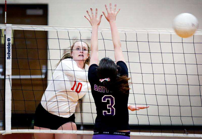 Courtney Bayles of Bayfield High School blocks the ball Sept. 27 while playing Durango High School at DHS. Photo by Jerry McBride/Durango Herald