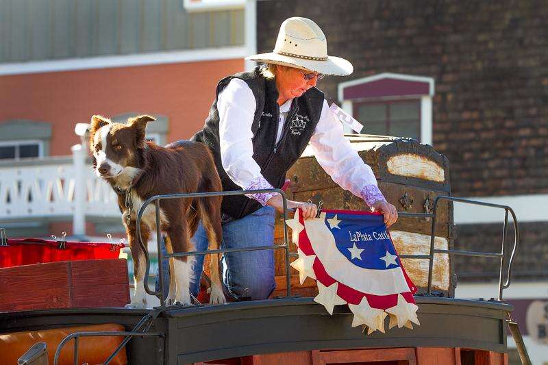 As “Doug” the dog watches the crowd, Melody Semler places a banner for the La Plata-Archuleta Cattleman’s Association on a stagecoach headed down Main Avenue Oct. 1 during the Durango Cowboy Poetry Gathering parade. Photo by Shaun Stanley/Durango Herald