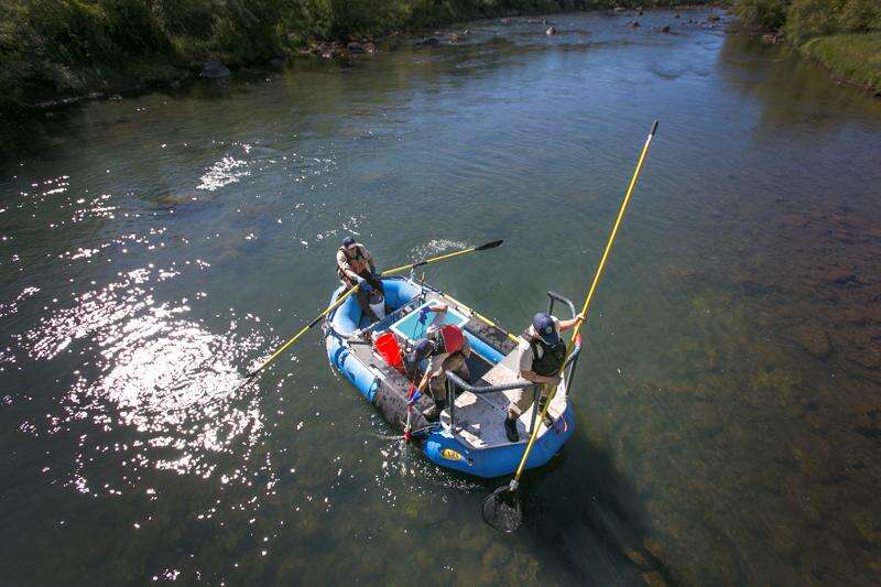 As Colorado Parks and Wildlife Aquatic Biologist Jim White steers their raft Sept. 8, seasonal aquatic technician Pete Deren stands ready to net fish stunned by Chris Lashmett during part of an annual fish survey in the Animas River. Photo by Shaun Stanley/Durango Herald