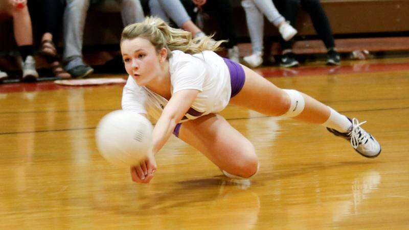 Emily Bauer of Bayfield High School dives Sept. 27 while playing Durango High School at DHS. Photo by Jerry McBride/Durango Herald