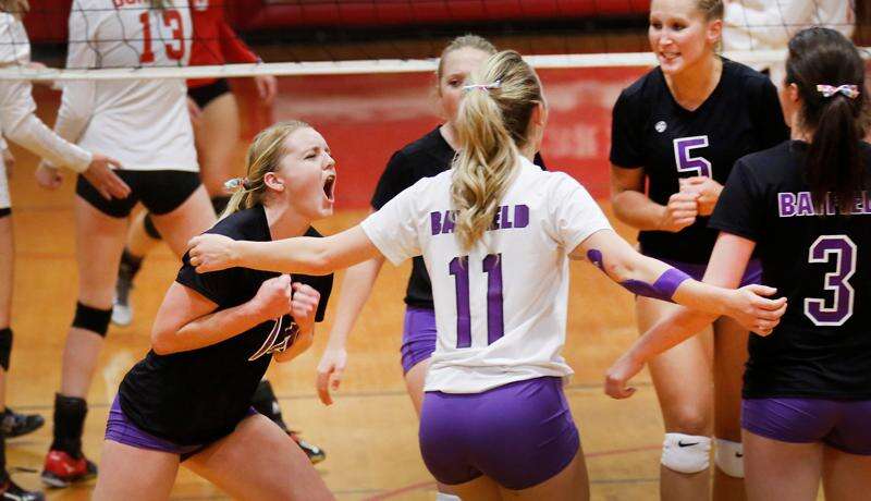Maddi Foutz of Bayfield High School celebrates a point with her team Sept. 27 while playing Durango High School at DHS. Photo by Jerry McBride/Durango Herald