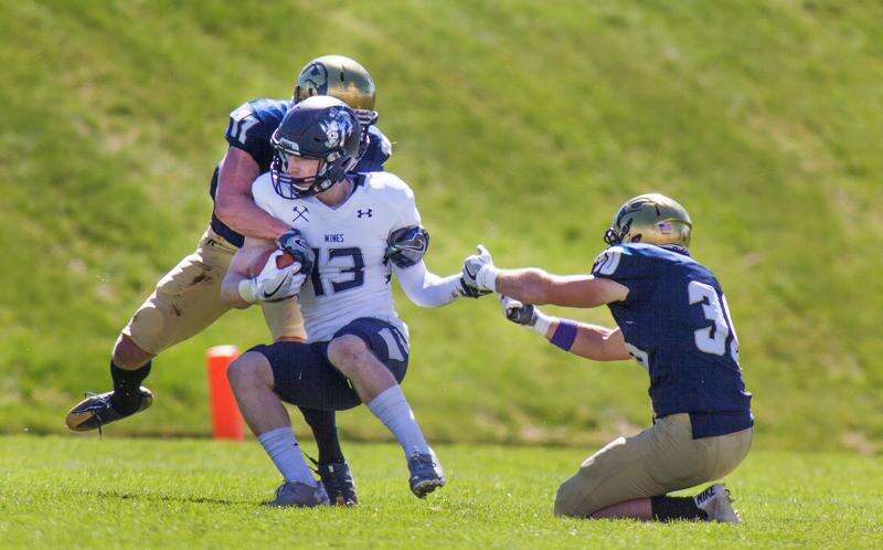 Fort Lewis College’s Cory Witt, right, and AJ Shaw tackle Colorado School of Mines’ Zach Richter after catching a pass Oct. 1 at FLC. Photo by Shaun Stanley/Durango Herald