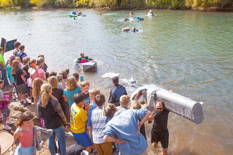 Students from Mountain Middle School line the shore of the Animas River at the 32nd Street put-in to watch their advisers from the school attempt to float across the river in rafts the students built out of only cardboard and duct tape. The schoolwide project was meant to enhance collaborative and team-building skills among the students. Head of School Shane Voss said it was an important trust-building exercise. Eighth-grade Teacher Leader Chris Hughes climbs out of the river, lower right. Photo by Shaun Stanley/Durango Herald