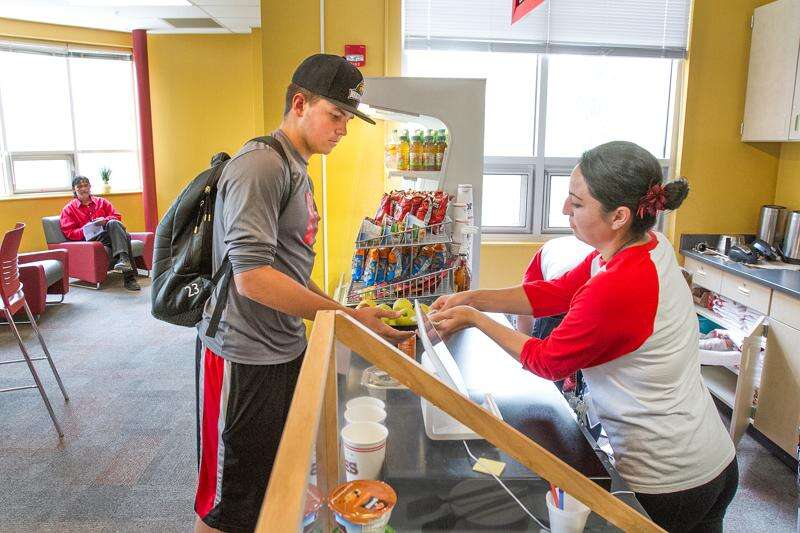 Durango High School senior Tyler Ruetschle buys a lunch item Sept. 20 at the newly opened Demon Deli at the school as Cristina Aramburo rings up his purchase. Photo by Shaun Stanley/Durango Herald
