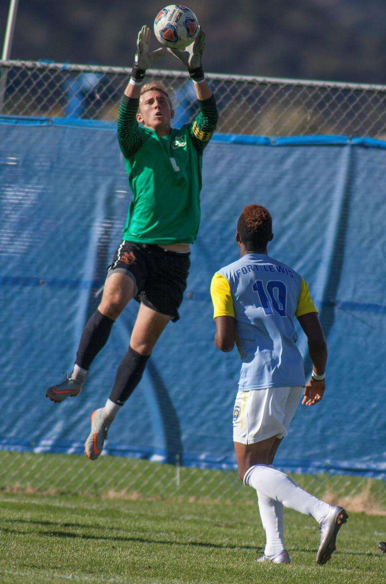 Fort Lewis College’s Churchill Onumonu watches as Colorado Mesa University keeper Briley Guarneri catches a goal shot attempt Sept. 30 in action at Derk’s field. Photo by Shaun Stanley/Durango Herald