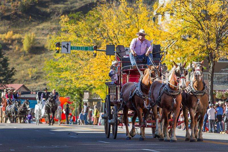 A horse-drawn stagecoach makes its way down Main Avenue Oct. 1 during the Durango Cowboy Poetry Gathering parade. Photo by Shaun Stanley/Durango Herald