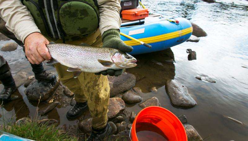 John Alves with the Colorado Parks and Wildlife prepares Sept. 14 to weigh a rainbow trout from the Animas River during a survey of fish population in the river. Photo by Shaun Stanley/Durango Herald